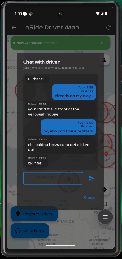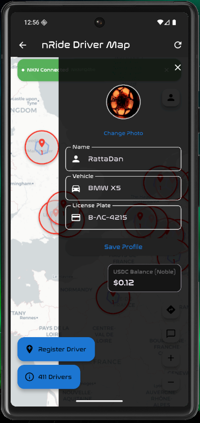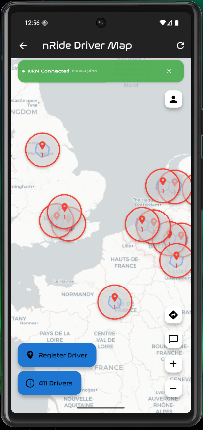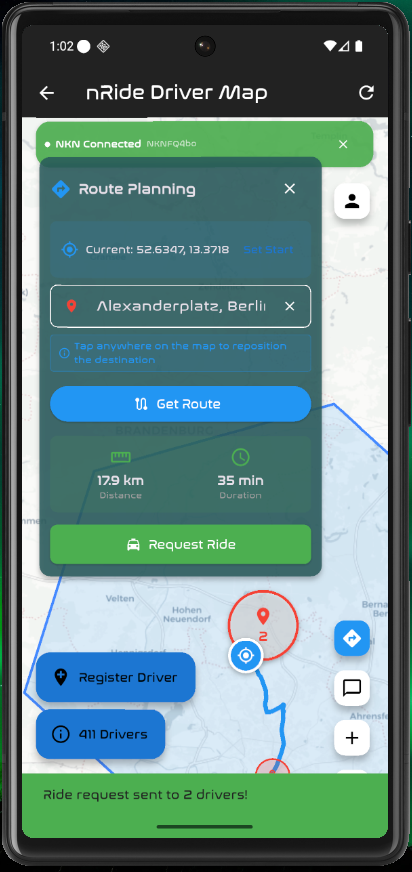The nRide project was founded in October 2021 at the Gitcoin GR11 Hackathon sponsored by NKN, where it won a prize for its innovative approach to peer-to-peer ride-hailing. At the beginning, the idea was to build an uber-like service where drivers and riders connect directly to one another, without relying on a central third party. After the hackathon, NKN accepted to fund a more advanced prototype, and from there the scope expanded to building a more generic protocol and a suite of open-source software packages that would allow the creation of compatible ride-hailing apps sharing a common pool of users.