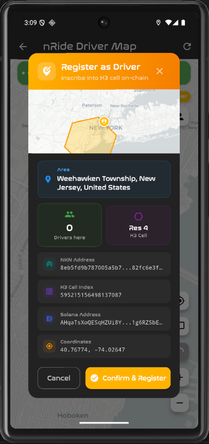 Clients subscribe their NKN ID into their local H3 cell index CosmWasm Contract, to establish encrypted p2p connection between driver and passenger